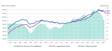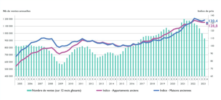 Depuis l’automne 2022, la baisse du volume annuel de ventes immobilières s’intensifie... les notaires ont actés en fin 2023 qu'une baisse annuelle aussi conséquente n’avait pas été atteinte depuis dix ans.